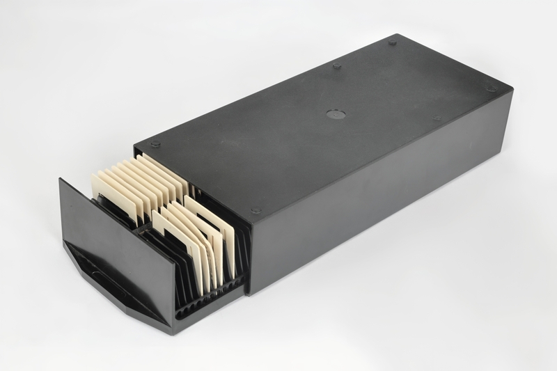 Caja de plástico para el almacenamiento de diapositivas. Capacidad para 100 diapositivas. En las guías se encuentran 47 diapositivas que se corresponden con imágenes de arte helénico: cerámica, escultura, arquitectura, etc.