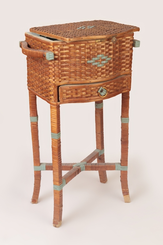 Costurero de madera cubierto de mimbre compuesto por dos compartimentos, uno con tapa abatible ubicado en la parte superior y un cajón bajo este, ambos forrados en tela azul. Se sustenta sobre cuatro patas, también trabajadas en mimbre con detalles en azul a conjunto con la decoración interior del costurero.