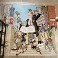 Pintura mural que, combinando el estilo del cómic y el trampantojo renacentista, pretende reflejar el devenir de la Facultad, tal y como señala la inscripción superior: FACULTAD DE DRET DE VALÈNCIA DES DE 1499. Así, se representan las diferentes sedes donde se han impartido los estudios de Derecho en la Universitat de València. A la izquierda, el antiguo Estudi General, sede histórica de la Universitat y actual Centre Cultural La Nau, donde se erigió la Facultad de Leyes y Cánones, con la emblemática escultura de Luis Vives que preside el claustro y parte de su característico peristilo de columnas. En el centro, el edificio proyectado por Manuel Moreno Barberá en los años 60, actual Facultad de Filosofía, con los brise soleil tan definitorios de sus muros, ubicado en la avenida Blasco Ibáñez, donde se impartieron los estudios de Derecho hasta la construcción del nuevo Campus de Tarongers, en el que se encuentra la actual Facultad. Esta se aprecia en la parte derecha del mural con el reconocible tono rojizo del ladrillo cara vista. Entre los personajes que acompañan la escena encontramos a grandes representantes de la intelectualidad valenciana, vinculados al ámbito del Derecho, como: Manuel Broseta y Carmen Alborch, a la izquierda, y Gregorio Mayans, Cirilo Amorós y Vicente Blasco Ibáñez, en la escalera principal. En el centro, estudiantes de las décadas del franquismo erigiendo una pancarta contra la dictadura y otros de época más reciente en pro dels “DRETS HUMANS”, que simbolizan la etapa en el edificio de Moreno Barberá, donde se vivió el retorno de la democracia y la lucha por la igualdad y los derechos civiles. A la derecha, estudiantes y profesores de los tiempos actuales, entre los que se refleja la diversidad y el respeto, imbuidos también del espíritu de Europa, representado por el halo circular de doce estrellas. Todo ello se culmina con la gran imagen de la Justicia que preside la escena, representada como una mujer corriente, ataviada con el atuendo de Magistrada, con toga, puñetas, medalla y placa. Porta un libro en el que se puede leer, a la izquierda, el artículo 10. 1 de la Constitución, y, a la derecha, el artículo 1.2. del Estatut d’Autonomia, referentes a la defensa de los derechos y los principios democráticos. Una mujer con la vestimenta rectoral, alusiva a la figura que dirige la Universidad, ayuda a sostener el enorme volumen. En el ángulo superior derecho de la composición aparece la balanza de la equidad, símbolo ineludible de la representación de la Justicia, alzada con orgullo por esta, quien mira hacia el futuro, pero consciente del pasado. -