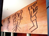 Mural compuesto por varillas de hierro de 3 x 3 cm. Incrustradas en una pared de ladrillo de 3'40 m x 20 m. -