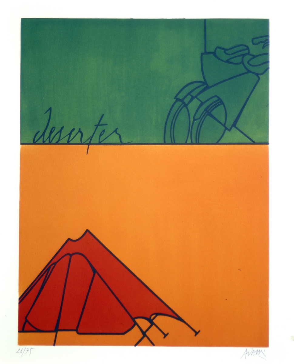 Composición dividida en dos planos de colores (verde, en la parte superior y naranja, en la parte inferior). El fuerte dibujo que delimita los dos objetos representados (moto y tienda de campaña) ofrece una lectura diagonal de la composición. Presenta reminiscencias pop-art aunque empleando los recursos propios del género del cómic, rasgo habitual en la obra de Adami.