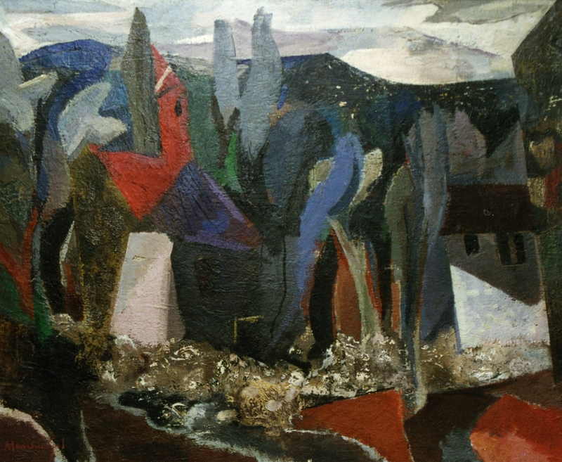Paisaje cubista de colorido fauvista compuesto a partir de gruesas pinceladas de vivos colores. En él se aprecia un riachuelo y algunas casas que se adivinan entre un frondoso bosque y un fondo de montañas que se define sobre un vibrante cielo de nubes brillantes.