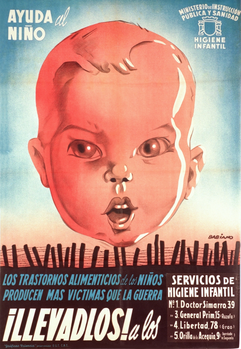 Cartel de guerra del Ministerio de Instrucción Pública y Sanidad. Higiene Infantil Ayuda al niño