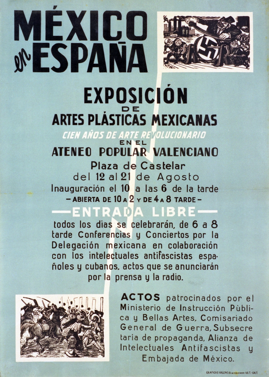 Cartel de guerra del Ministerio de Instrucción Pública. Dirección General de Bellas Artes México en España. Exposición de artes plásticas mexicanas…