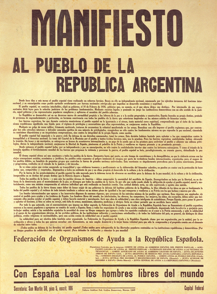 Cartel de guerra de la Federación de Organismos de Ayuda a la República Española Manifiesto al pueblo de la República Argentina