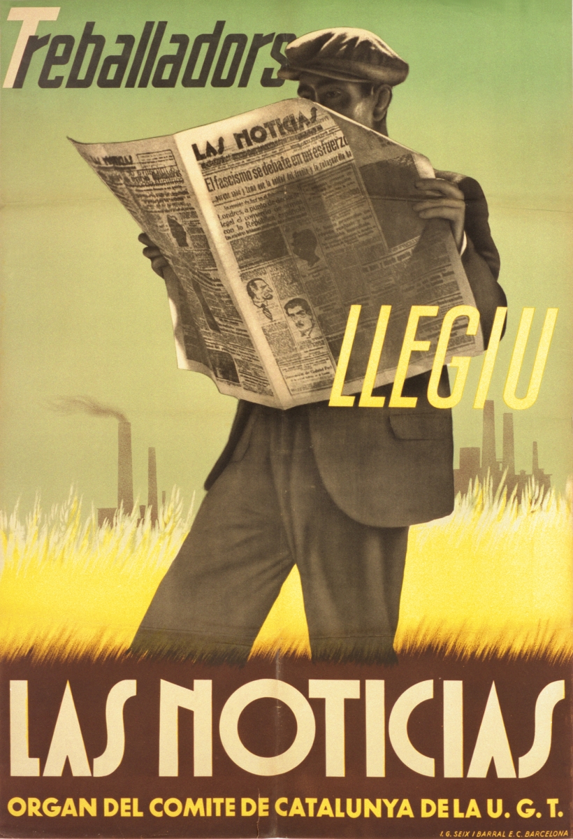 Cartel de guerra del periódico Las Noticias. Órgano del Comité de Cataluña de la UGT. Treballadors llegiu