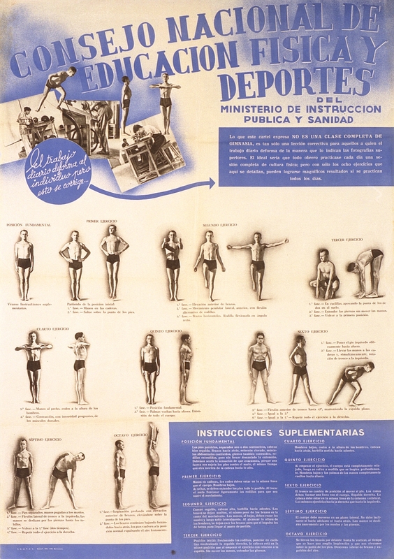 Cartel de guerra del Consejo Nacional de Educación Física y Deportes. Ministerio de Instrucción Pública y Sanidad El trabajo diario deforma al individuo…