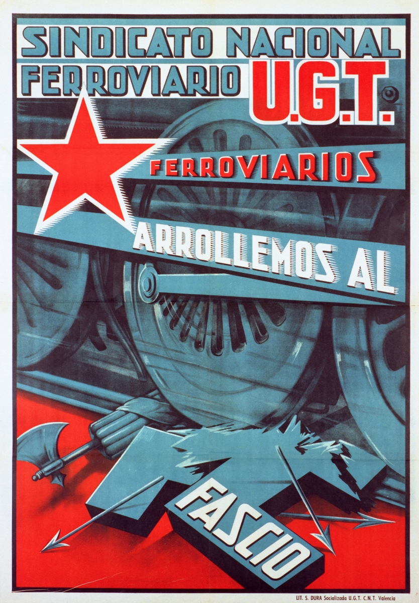 Cartel de guerra del Sindicato Nacional Ferroviario. UGT. Ferroviarios arrollemos al fascio