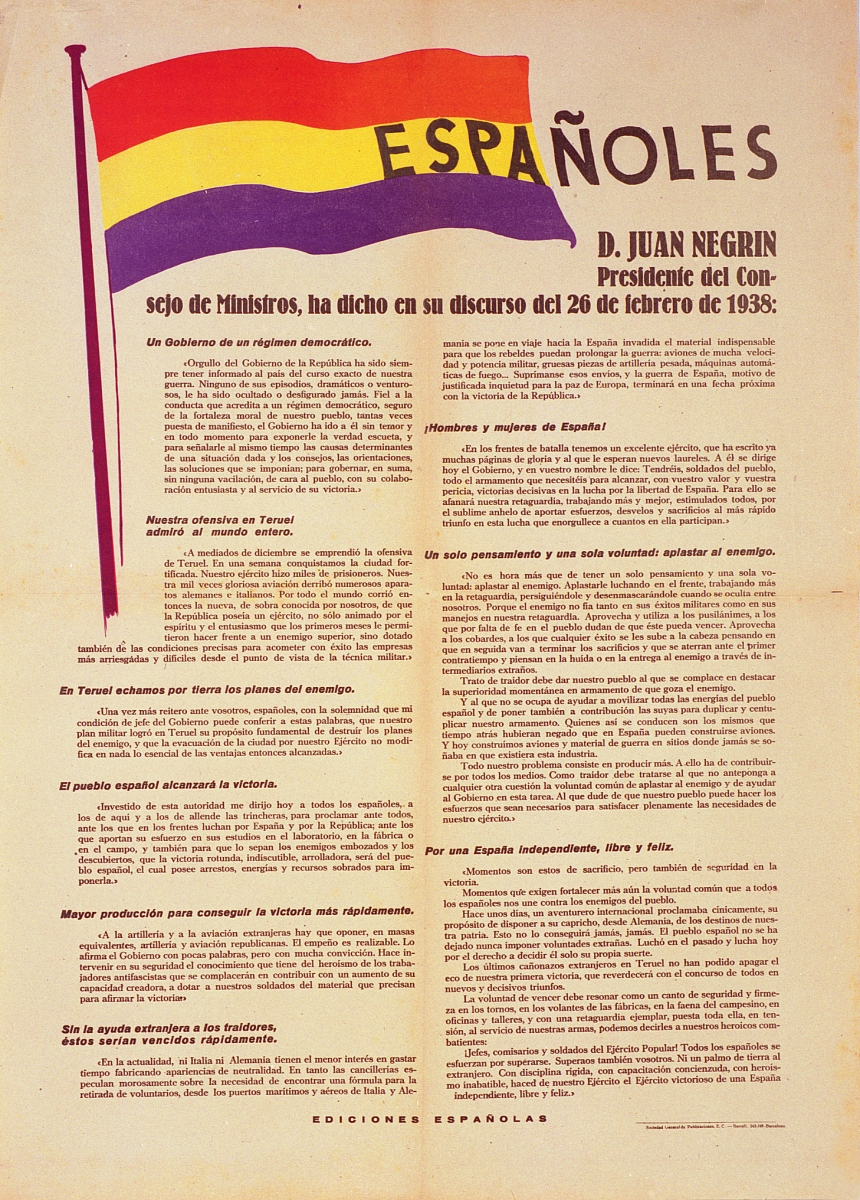 Cartel de guerra Españoles. D. Juan Negrín Presidente del Consejo de Ministros, ha dicho en su discurso del 26 de febrero de 1938…