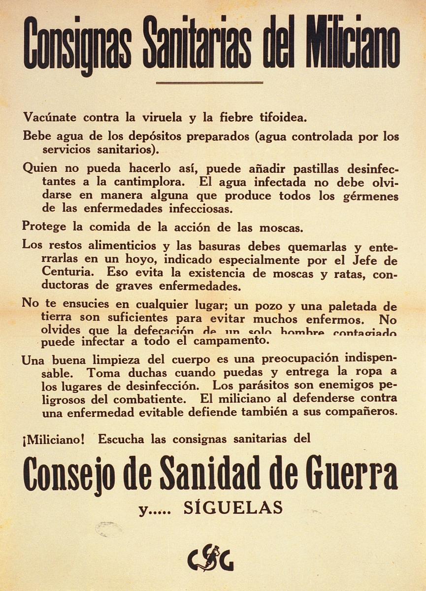 Cartel de guerra del Consejo de Sanidad de Guerra (CSG) Consignas Sanitarias del Miliciano