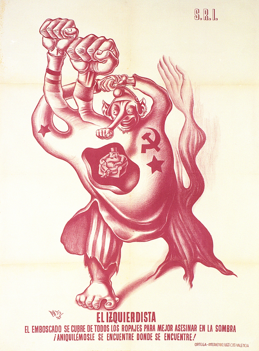 Cartel de guerra del Socorro Rojo Internacional (SRI) El Izquierdista. El Emboscado se cubre de todos los ropajes para mejor asesinar en la sombra…