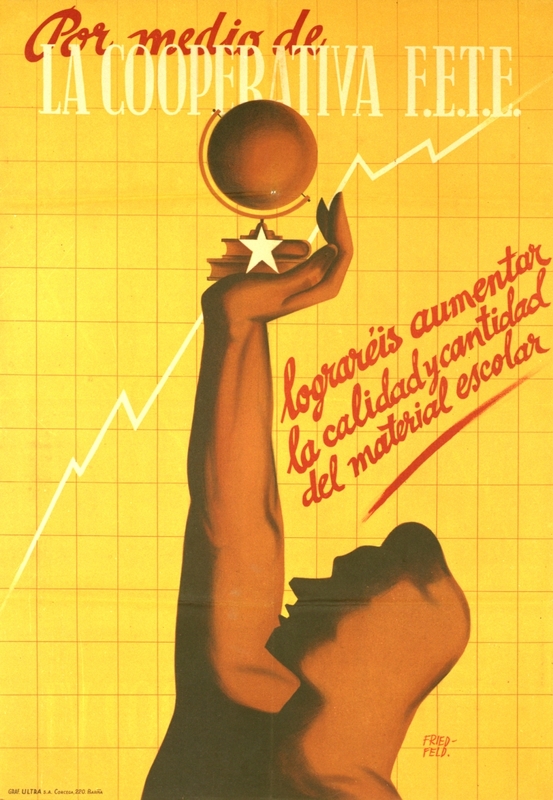Cartel de guerra de la FETE- UGT. Por medio de la cooperativa FETE lograréis aumentar la calidad y cantidad del material escolar