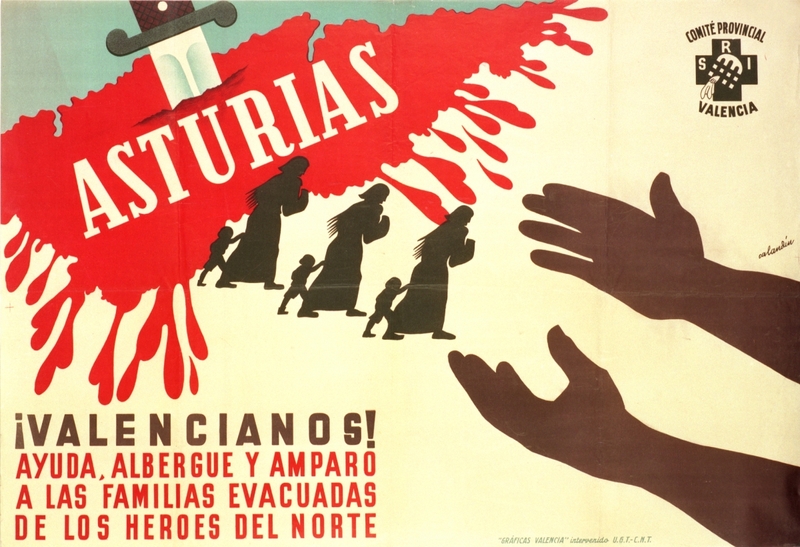 Cartel de guerra del Socorro Rojo Internacional (SRI). Comité Provincial de Valencia Asturias. ¡Valencianos! Ayuda, albergue y amparo…