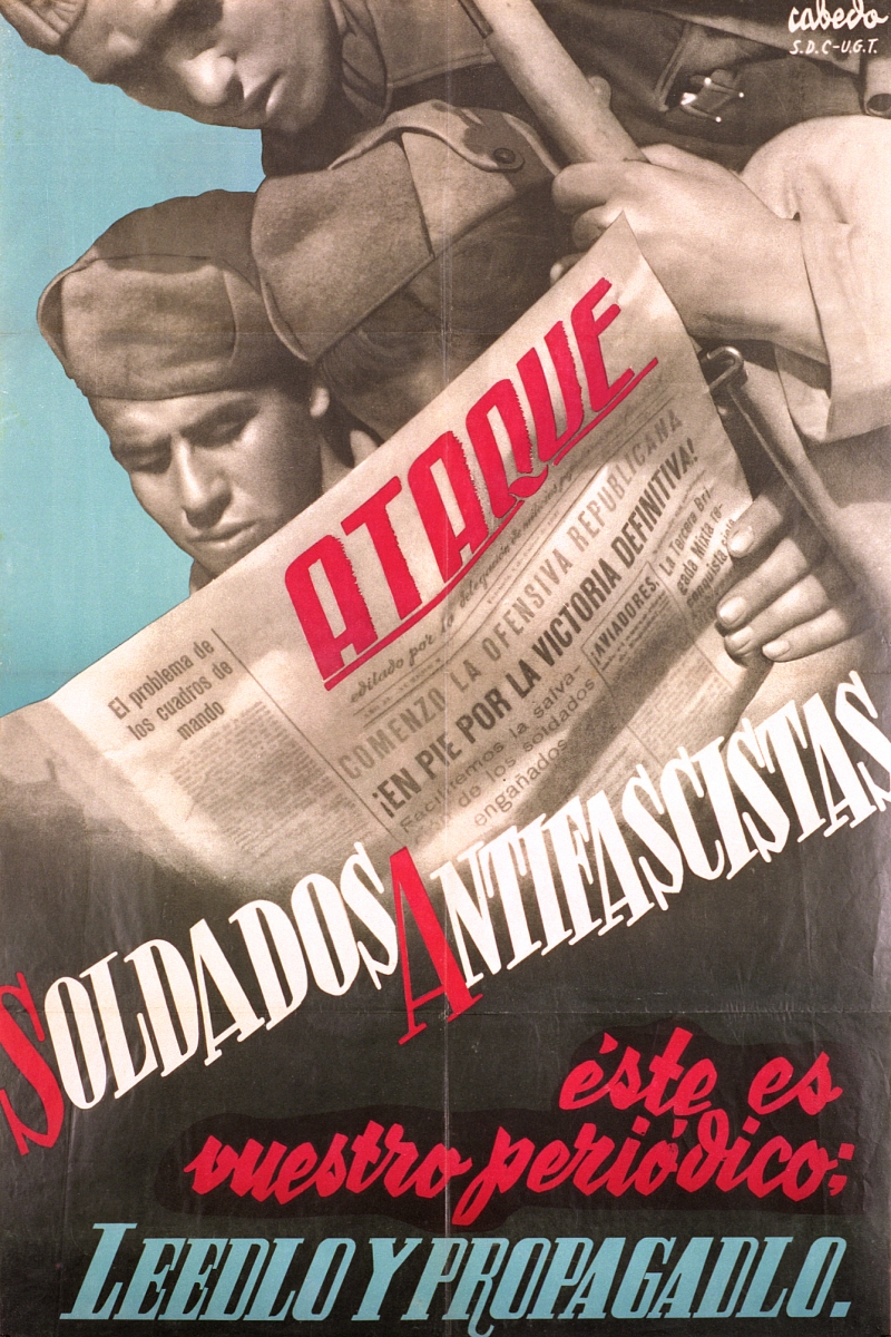 Cartel de guerra del periódico Ataque Soldados antifascistas éste es nuestro periódico; leedlo y propagarlo