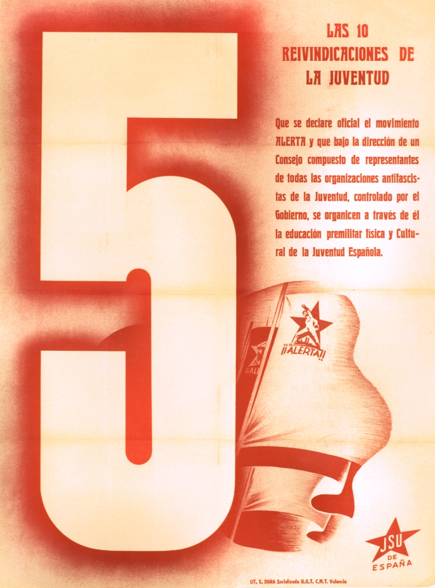 Cartel de guerra de la Juventud Socialista Unificada (JSU) de España Las 10 reivindicaciones de la juventud (5)