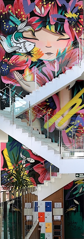 Composición en vertical que recoge las formas oníricas de corte naïf características de las creaciones de Julieta XLF. Así, se representa en primer plano el rostro delicado de una niña de cuyas manos emergen dos lenguas de fuego, símbolo de inteligencia, creatividad, iluminación y cambio. Se halla rodeada de flores exóticas y peces de gráciles aletas, ligados a la prosperidad, las emociones y la fluidez, que confieren al conjunto un halo de harmonía y serenidad en este jardín vertical de explosión de naturaleza marcada por el ritmo de las formas y la alegría de los colores vivos que imperan en la pintura.