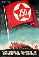 Cartel de guerra de la Juventud Socialista Unificada (JSU) de España Conferencia Nacional de Juventudes Socialistas Unificadas. Enero 1937