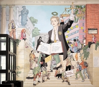 Entre los personajes que acompañan la escena encontramos a grandes representantes de la intelectualidad valenciana, vinculados al ámbito del Derecho, como: Manuel Broseta y Carmen Alborch, a la izquierda, y Gregorio Mayans, Cirilo Amorós y Vicente Blasco Ibáñez, en la escalera principal. En el centro, estudiantes de las décadas del franquismo erigiendo una pancarta contra la dictadura y otros de época más reciente en pro dels “DRETS HUMANS”, que simbolizan la etapa en el edificio de Moreno Barberá, donde se vivió el retorno de la democracia y la lucha por la igualdad y los derechos civiles. A la derecha, estudiantes y profesores de los tiempos actuales, entre los que se refleja la diversidad y el respeto, imbuidos también del espíritu de Europa, representado por el halo circular de doce estrellas.