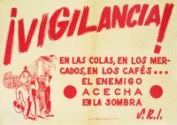 Cartel de guerra del Socorro Rojo Internacional (SRI) ¡Vigilancia! En las colas, en los mercados, en los cafés… El enemigo acecha en la sombra