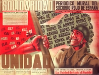 Cartel de guerra del Socorro Rojo de España (SRE) ¡Solidaridad! Periódico mural. Los combatientes, unidos, exigen la unidad de todo el pueblo